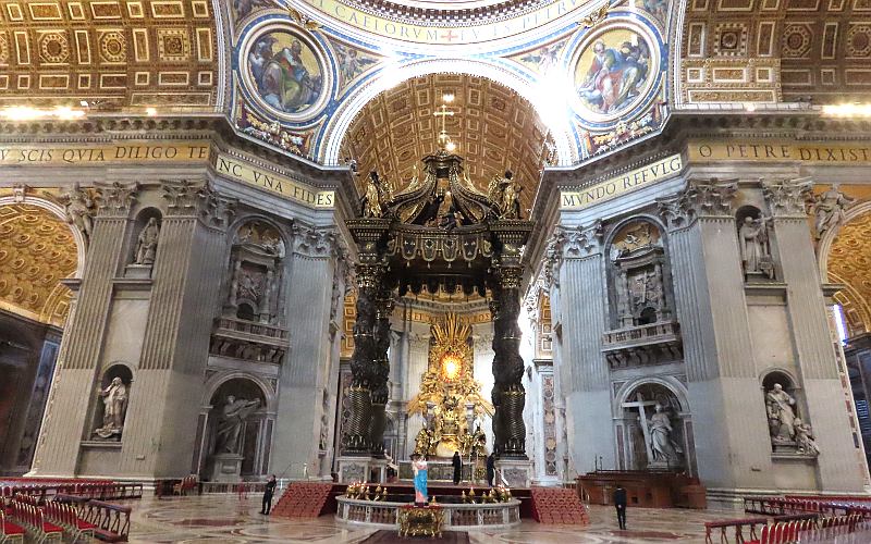 St. Peter's Basilica from St. Peter's Square There is a taxi line on the opposite side of the Pantheon and although the Vatican City is only about a 25 minute walk from our hotel, on Friday morning we took a taxi to near St. Peter's Square so we could be there earlier and fresher for being on our feet for most of the next 8 hours. We walked St. Peter's Square and then were delighted to find that there was no line waiting to visit St. Peter's Basilica. The large (over 200 yards deep) space is very ornate and we started our slow exploration of the huge church with the most famous art, Michelangelo’s "Pietà" depicting the Virgin Mary cradling the dead body of Jesus. The beautiful art filling the church is overwhelming. In addition to the nearly countless individual pieces of art, the walls and ceiling are filled with mosaics which look like paintings, but preserve the colors so much better. We did not do the tour to the top of the dome.
