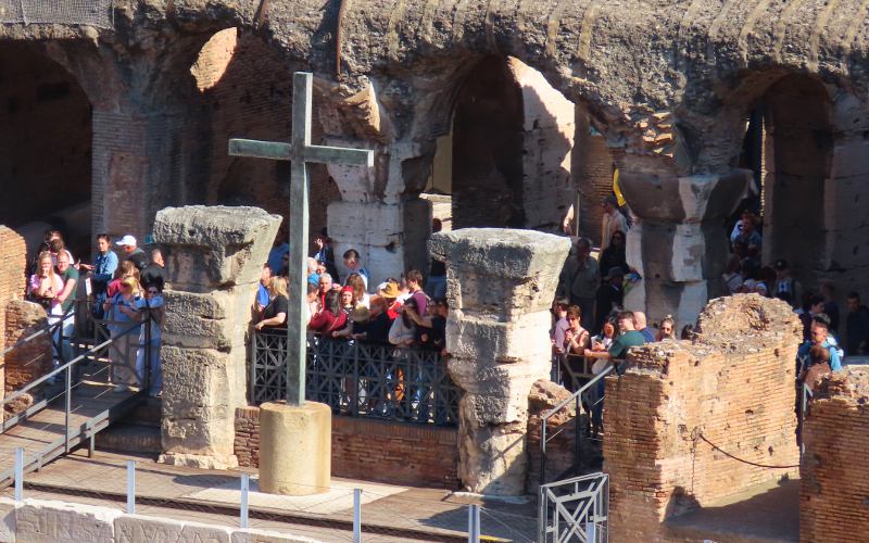 Colosseum - Rome, Italy Saturday was one of the fullest and most interesting days of the trip. The exploration was in the opposite direction from our hotel, starting with a timed entrance to the Colosseum at 8:45 AM. A week earlier, I had booked the tickets at 2 AM Kansas City time, when they went on sale exactly a week in advance of the time slot. In 2012, we visited the older and better preserved Verona Arena in northern Italy, but this building is much larger and we spent over 2 1/2 hours exploring the Colosseum.