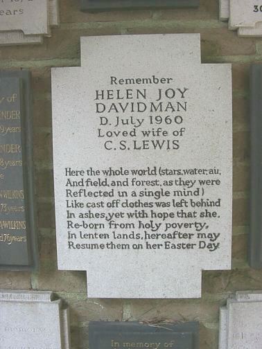 2004 UK Trip Day 4 Monday April 5 (continued) For me, the highlight of the C. S. Lewis tour of Oxfor was the stop at Holy Trinity Church in Headington Quarry. Ron Brind has a key to Holy Trinity Church and I photographed Jack & Warnie's pew and the wonderful engraved Narnia window next to it. Then we visited Jack & Warnie's graves and the grave of Mrs. Janie King Moore, who's relationship with Jack leaves so many unanswered questions. Ron gave me some ivy leaves from the tree above Jack's grave.