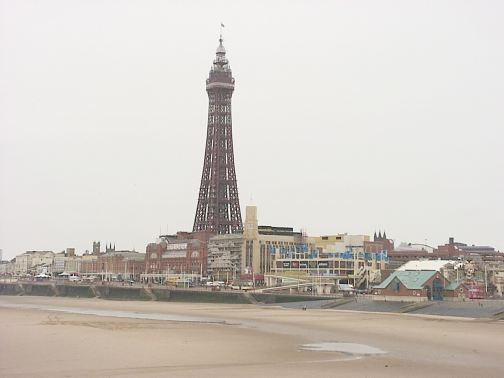 2004 UK Trip Day 8 Friday April 9 I'm not a breakfast eater, but decided to try the Full English Breakfast that came with my room. I did tell them to hold the baked beans but had bacon, sausage, egg, toast and fried tomato. It turned out that I had been the only guest in the hotel that night, though the rest of the weekend they would be full. The first guests arrived while I was having breakfast. Then out to see Blackpool. I have only found one person from the US who admitted to having heard of Blackpool. That one had seen it in the 1995 movie Funny Bones, staring Peter Chelsom, Oliver Platt & Jerry Lewis. Blackpool is the largest tourist destination in the UK, but is rarely visited by foreigners. A blue collar shore resort that developed in the 19th century, it reminds me of many New Jersey shore communities. Instead of a boardwalk, there is a promenade that extends several miles along the shore, much of that area filled with arcades, snack shops, shows, bars and other amusements. There are three piers and a 110 year old tower inspired by the Eiffel Tour. There are 3,500 hotels and guest houses in Blackpool.