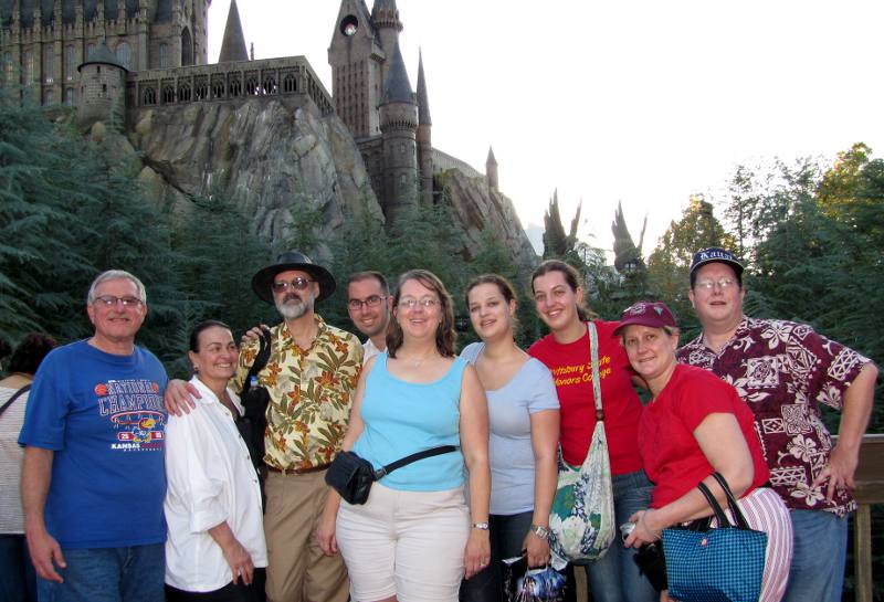 Tuesday day 4 We spent all day and evening at Universal Islands of Adventure. On our way in, we stopped to ride "One Fish Two Fish Red Fish Blue Fish," but quickly continued to the The Wizarding World of Harry Potter, where we spent most of the day. The food was fair and I like the community of Hogsmeade, but the crowds were so bad in the area! The best part was the Harry Potter and the Forbidden Journey ride, which may be the best theme park ride anywhere. The line to the start of the ride is a treat as it gives a tour of Hogwarts School of Witchcraft and Wizardry, and includes several very nice effects. There are many little things which help make The Wizarding World of Harry Potter special, such as the the displays and figures in the windows, the smoke curling up from the chimneys and the sound of Moaning Myrtle haunting the rest room. One tip to save a long wait in line: everyone wants to try the Butterbeer and pumpkin juice at Hogsmeade, but there is no reason to get in the long line at the cart. The line is much shorter at the Three Broomsticks and you will want to check out the decor of this tavern anyway. A branch of the Diagon Alley Ollivanders Wand Shop has opened at Hogsmeade. The line to get probably was longer than it was worth, but we were there to see all of the Harry Potter Wizarding World. Finally, we were admitted with a group of about 20 people. One child was plucked from the crowd to have a wand select them. When the child tries the first few wands, some thing explodes or falls, but finally the child is given the correct wand and the room resonates. Everyone gets a chance to select and purchase a wand in the attached Dervish and Banges magic shop (and many other locations around the Universal parks).
