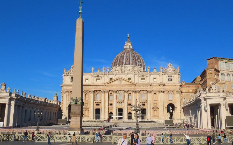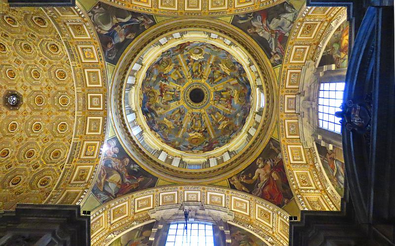 St. Peter's Basilica from St. Peter's Square There is a taxi line on the opposite side of the Pantheon and although the Vatican City is only about a 25 minute walk from our hotel, on Friday morning we took a taxi to near St. Peter's Square so we could be there earlier and fresher for being on our feet for most of the next 8 hours. We walked St. Peter's Square and then were delighted to find that there was no line waiting to visit St. Peter's Basilica. The large (over 200 yards deep) space is very ornate and we started our slow exploration of the huge church with the most famous art, Michelangelo’s "Pietà" depicting the Virgin Mary cradling the dead body of Jesus. The beautiful art filling the church is overwhelming. In addition to the nearly countless individual pieces of art, the walls and ceiling are filled with mosaics which look like paintings, but preserve the colors so much better. We did not do the tour to the top of the dome.