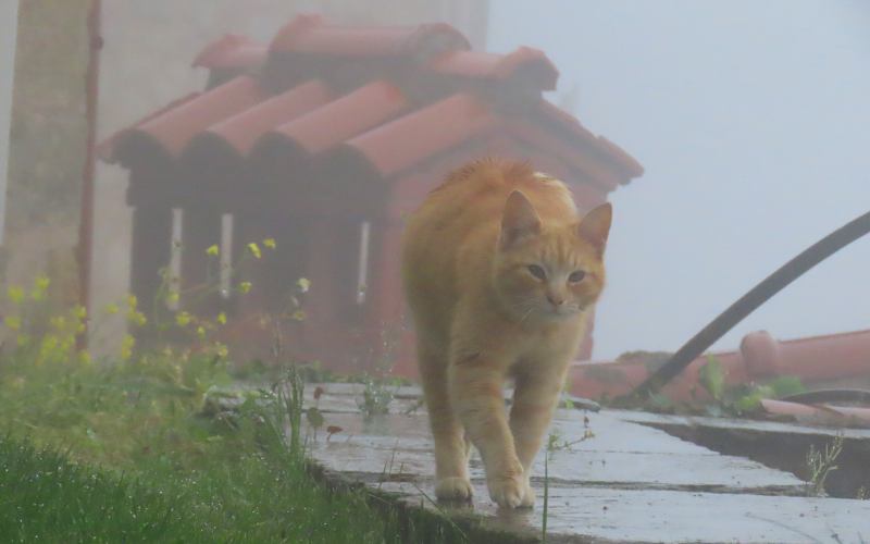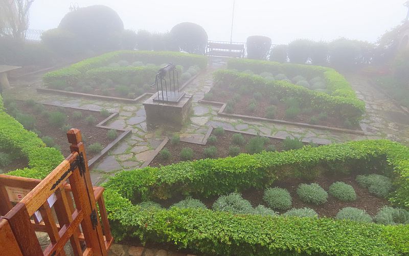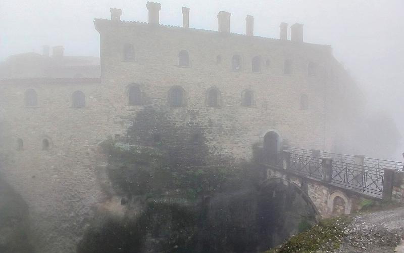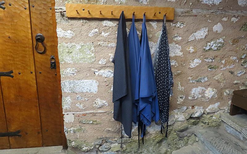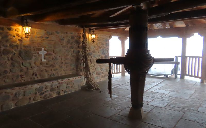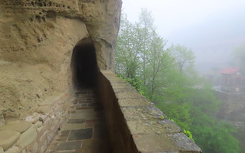 Going up to the Holy Monastery of the Great Meteoron The Tsikeli Hotel Meteora included an excellent, elaborate breakfast buffet. As I already mentioned, today the pillars were shrouded in heavy fog or low clouds. If the clouds had been lower and the monasteries had risen above them, it could have been spectacular, but as it was, we could barely see the monasteries even when right next to them. It was a bit disappointing, but we had many days of beautiful weather during our trip and this was the only day the weather genuinely reduced our experience. Five of the monasteries were open this day and we were going to visit 4, starting with Holy Monastery of the Great Meteoron, which began in 1356 and slowly grew over the years. Today there are 9 monks living here whose ages span 27 to early 90s. There have only been stairs to go to the monasteries since about 1925 when they started being a tourist attraction and gained a new income stream. All of the monasteries have a rigid dress code for visitors, requiring women to have long skirts and men long trousers. All must have their shoulders and arms covered. Linda had brought along a skirt to slip on over her jeans, but wrap-around skirts were available at the entrances. With the heavy fog and occasional showers, her skirt was soon damp.