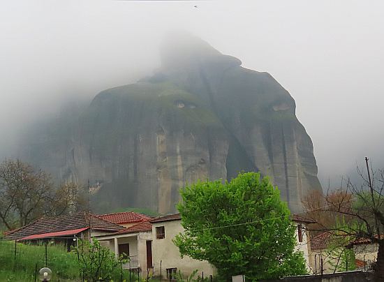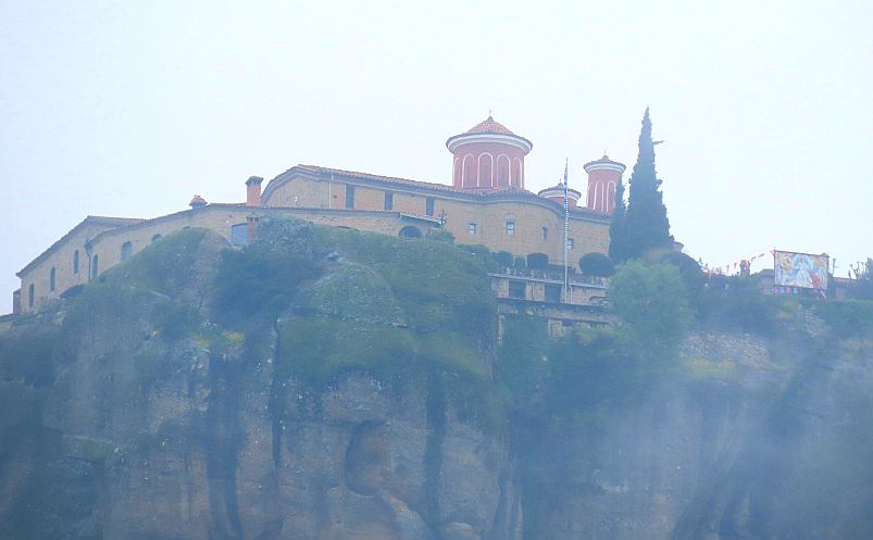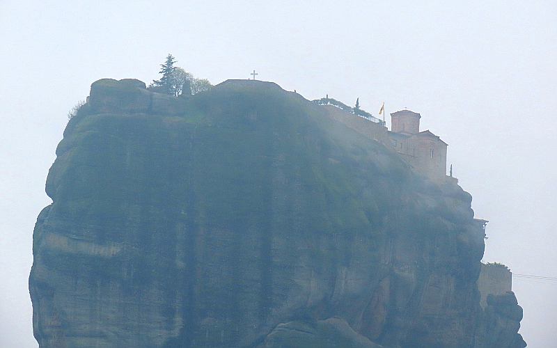 It was time to be getting on our way, and we drove down to Kalabaka, a large community a little farther from the stone pillars, and had lunch at Restaurant-Taverna Panellinion, before our 4 hour drive back to Athens. As we left town, the fog by the monasteries was lighter and we took some photos on the way out of town.