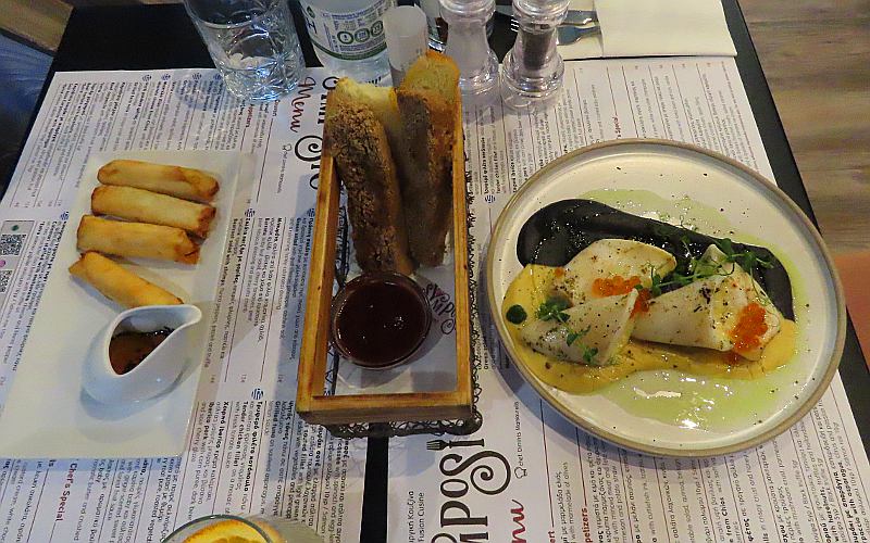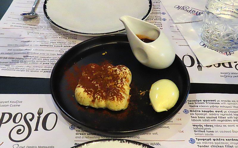 We returned to the Hotel Ivy Suites and checked into the 6th floor Ivy Suite. We were the only suite on this floor, with a slightly better view and a little more comfortable layout. Supper was at Symposio Restaurant, a few minutes walk from the hotel. We had a light supper of feta rolls and calamari stuffed with metsovone cheese & Florini pepper. We had one of our few desserts with a meal, a Banoffee with Bailey's flavored cream, salted caramel, banana and vanilla ice cream.