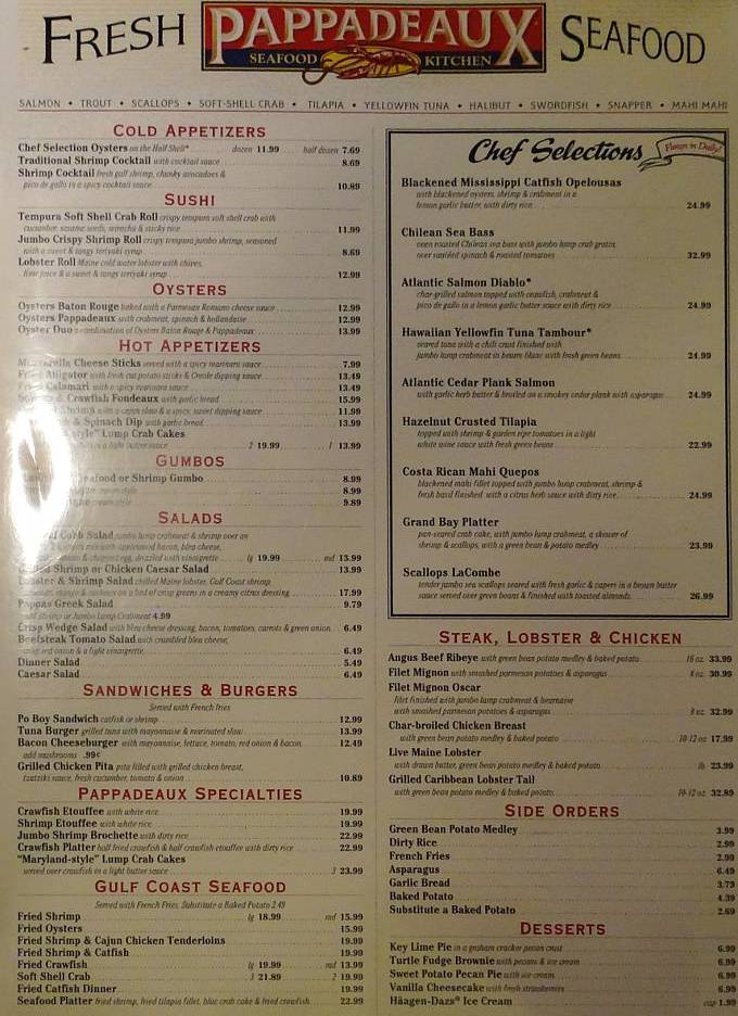 Pappadeaux Seafood Kitchen - Dallas Fort Worth Airport Saturday day 1 Between preparing for half of the interior of the house to be painted during our trip and preparing to be out of town for 10 days, we were late getting out of the house. It seemed as if many little things went against us and we got in the security line at the airport only about 35 minutes before our scheduled departure. We made it, but there was no chance for lunch, restroom breaks or anything else. We did luck out and we had one of the few empty seats on the plane next to us, We had a light lunch of jerky and nuts on the airplane. We had a comfortable 3 hour layover in Dallas and found a very nice restaurant in Terminal A. A restaurant where we will eat again on future trips - Pappadeaux Seafood Kitchen. Pappadeaux is part of a small chain. The menu listed locations in 8 other cities. Pappadeaux is located down its own escalator and has a large attractive space. It does not feel like an airport restaurant. Linda had fried catfish and shrimp with a large, loaded baked potato. It was $22.68 including a fairly large up charge for substituting the baked potato for fries. She thoroughly enjoyed her meal. I had an $8.99 crawfish bisque and $15.99 fried oysters and French fries. Though the serving was large, I thought the bisque was a little pricey. Otherwise, the meal was reasonable for the nice restaurant they were served in. This bisque was salty and spicy. I didn't notice the heat so much while I was eating the bisque, but noticed it more after the fact. The servings of fried oysters and potatoes were quite generous. The oysters were very good, the fries were about as good as you can get from frozen. This good meal was a nicer start to our vacation.