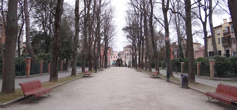 Monday continued We continued along the Castello waterfront with no specific destination in mind. Castello is the largest and most varied of Venice's six sestiere (districts). The further we walked east, the more working class the area appeared and we saw fewer tourists. We turned away from the water when we reached Via Garibaldi, which was the widest street we saw anywhere during our time in Venice. ("Via" is Italian for "the way" or "street.") We turned again when we found gates leading to a monument devoted to Giuseppe Garibaldi (an Italian general, politician and patriot dubbed the "Hero of Two Worlds.") and Viale Garibaldi, a quiet, tree lined esplanade. At the other end of the Viale Garibaldi , we found an interesting large greenhouse called the Serra dei Giardinim, which I since learned was built as the Margherita Greenhouse in 1894 and is now maintained by a cooperative.