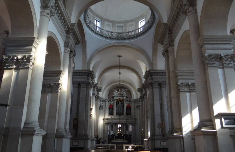 The interior of San Giorgio Maggiore is very bright with massive columns