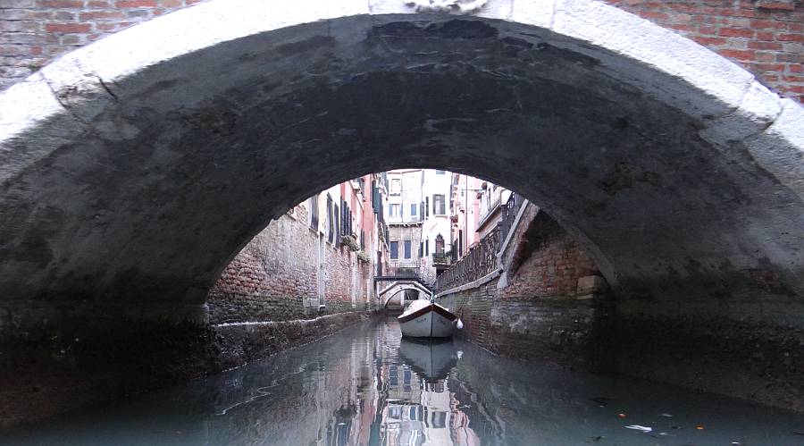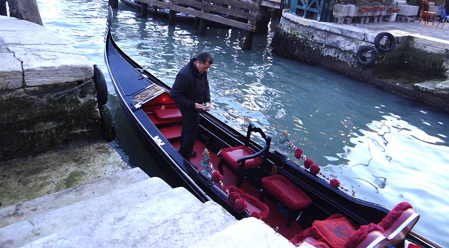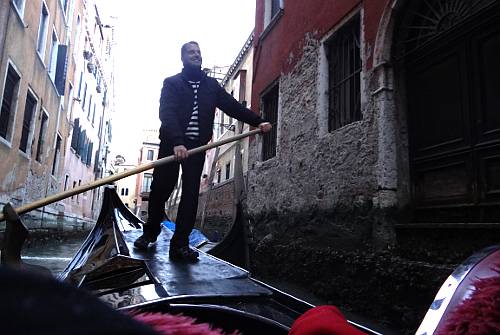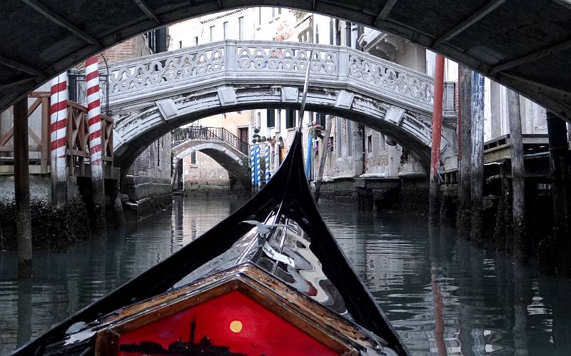 Approaching the Rio di Palazzo and the Bridge of Sighs Thursday continued After a short break back at our hotel, dusk was approaching and it was time for our Gondola Ride. Linda said that if we did a gondola ride, she wanted to pick the operator, and she selected a gondola and operator in the small canal next to the Fondamenta del Vin near our hotel. The charge was 80 euros for a 40 minute ride. The price would have been 20 euros more after 7PM. The ride was romantic, but the best part of it was going down some back canals which can not be visited on foot. Although a couple of stretches didn't smell very good, it was peaceful and nice.