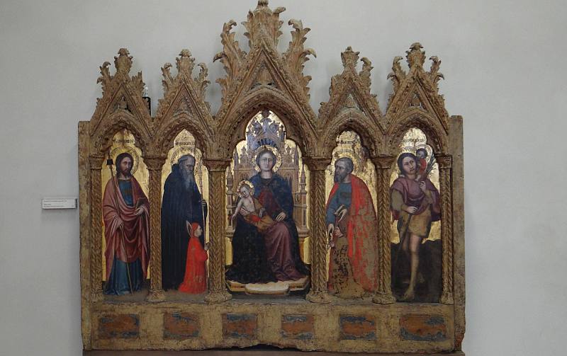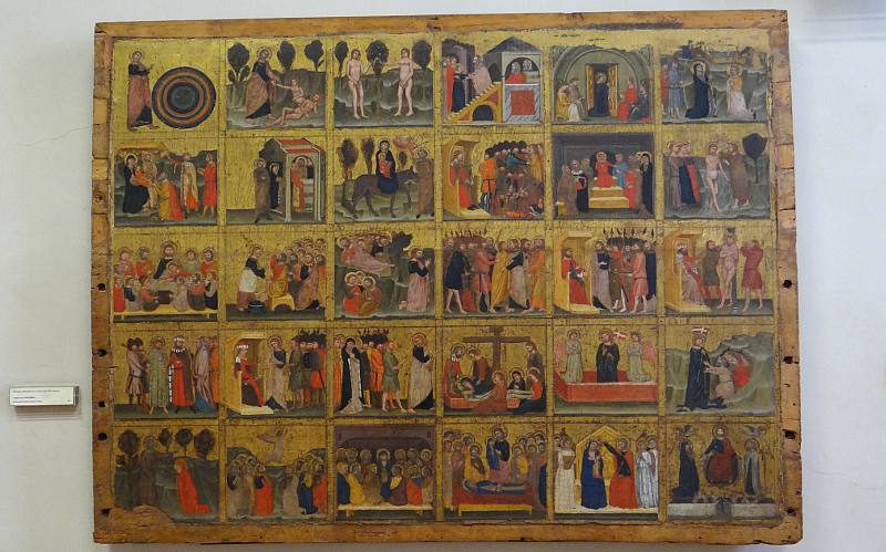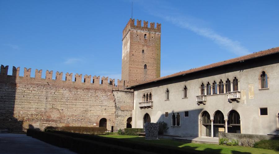 Museo Civico di Castelvecchio (Castelvecchio Museum) Friday, day 7 We had enough time to spend a couple of hours exploring Verona before catching our train to Milan, and I reviewed our brochures to find the medieval bridge which I had seen in postcards in town. I decided that the bridge was attached to the Museo Civico di Castelvecchio, which was only a few blocks from our hotel. Although there have been changes over the years, the castle was built as a fortified bridge across the Adige River between 1354 and 1356 by order of Cangrande II della Scala. Today Castelvecchio is home to the Castelvecchio Museum and the local officer's club. We were really there to see and photograph the bridge, but since our Verona Cards included access to the museum, we started with a walk through the museum collection of sculpture, paintings, weapons, ceramics, miniatures and church bells. The Verona card was a great value during our visit. For 10 euros ($13) the 24 hour card gave us access to every attraction we visited in Verona and the bus system which we did not use. As we were walking along the upper floor, we came to a stretch on the outside and I climbed a set of stairs to photograph the bridge from above. But when we got to the top of the wall where I could see that there were some people in period costumes on the bridge, two security guards came out of the museum and made me come down. They said that we couldn't cross the bridge this day, but did not explain why. A little farther along the outside, there was a partially enclosed walkway along the river where we could at least see the bridge from the side. We had glimpses of a movie being filmed, with periodic sounds of battle. I have since learned that they are filming Romeo and Juliet.