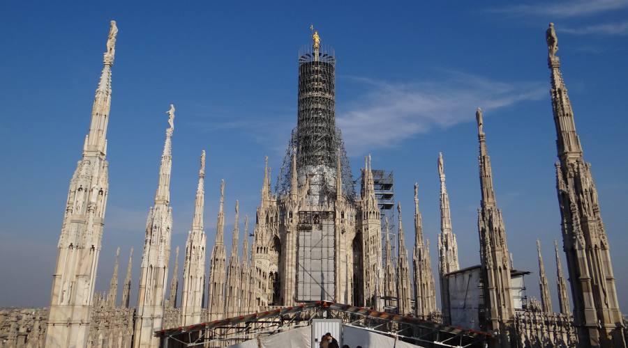 Linda took at least as many photos as I did on the cathedral roof Saturday continued After our free visit to the interior of the Duomo di Milano, we went outside to find the elevator to the roof. We walked 2/3s of the way around the Milan Cathedral and then found out that tickets were sold in a storefront across the street. When we tried to use the Milano Card for a small discount, we were told that it could only be used at another building on the far side of Piazza del Duomo and it wasn't worth taking that much time to save a dollar. We could climb steps to the roof for 5 euro or take the elevator for 8 euro. When we got to the roof, we were doubly glad we had taken the elevator - the stairs turned out to be quite narrow and people have to squeeze by each other to use them. When we first got to the Roof of the Duomo di Milano, there were only the few people who had gone up in the same elevator, but as we moved on to more interesting areas it became more and more crowded. When there were more stairs going to an even higher portion of the roof, the stairs were very narrow and people formed a single file, but the line went on and on until people started forcing their way past going the opposite way. We were pressed against the wall on one side and people on the other. The roof was so beautiful and neat that we were up there for an hour. There are over 2,000 statues on the roof. The cathedral was built over a 700 year period and no one knows exactly how many statues there are. They estimate that the total number of statues in and on the building is about 3,200 - 3,400. Construction began at the rear of the church and portions of the building were placed into use as the construction advanced. The doors on the front of the building were finished just a few years ago.