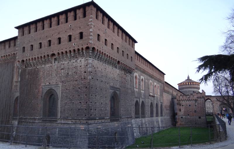 We took the red line to the Metro stop Cairoli, and it was a short walk to the Castello Sforzesco (Sforza Castle). It is a Renaissance castle that was once the seat and residence of the Duchy of Milan. Sforza Castle is one of the largest citadels in Europe and now houses several of the MIlan's museums and art collections. We arrived just after the gate had closed, but walked around the exterior at dusk, taking photographs.