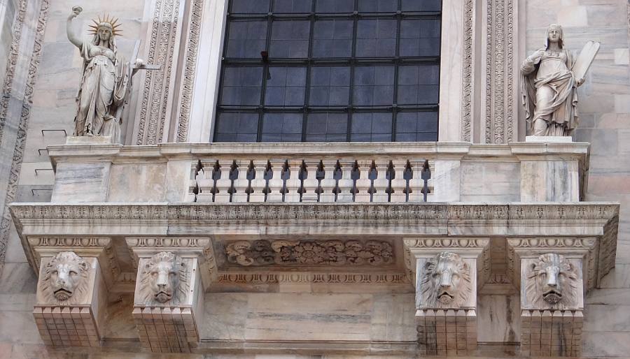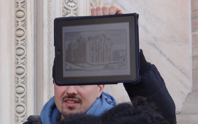Goudin Ludovic was our guide for the Best of Milan tour Sunday, day 9 We started the day by returning to the Piazza del Duomo on the Metro. After a quick breakfast at a restaurant in the Galleria we headed over to the Vittorio Emanuele II Statue in Piazza. At least we assume it was there, the statue is currently covered by scaffolding and the restoration is expected to continue until late October. We were there for LastSupperTickets' "Best of Milan" tour and were met by our guide and a technician who outfitted all of us with receivers and ear buds for the tour. Our guide was a young French man who is living in Milan, Goudin Ludovic. With this being a Sunday, the tour could not go inside the Duomo di Milano (Milan Cathedral). That was part of the reason that we visited the Cathedral on our own on the day before. But Goudin did take us around the outside of the church and give us more background which we had not learned on the day before. He used a tablet computer to show us images to better explain the history. The tour also went through the Galleria Vittorio Emanuele II before leaving the immediate area of the Piazza del Duomo. The headphone worked fairly well, but did hurt the interaction between the tour guide and the people taking the tour. I think it would have been good if we had gone in the cathedral, but it probably reduced the quality of the overall tour.