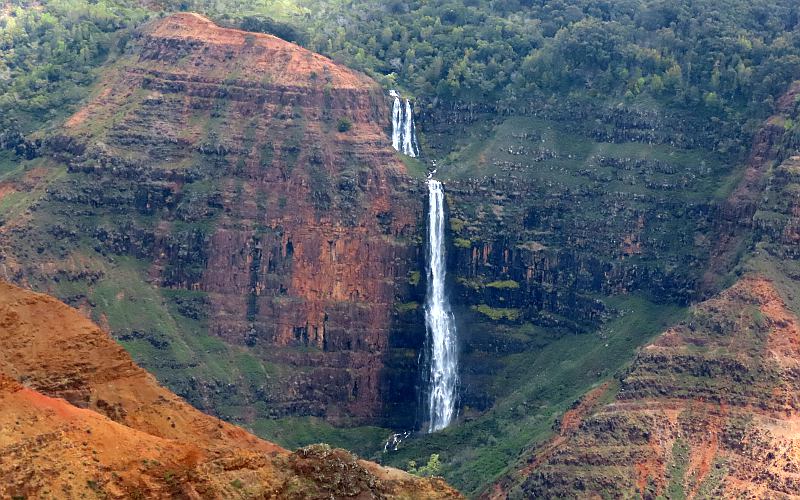 Kalalau Valley from Kalalau Lookout Sunday - Day 3 We had another early start this morning, taking advantage of it being Sunday to drive south through Lihue without morning rush hour traffic. We drove west to Waimea Canyon State Park and straight through to the end of the road to make our first stop at Kalalau Lookout and then to visit the other lookouts on the return drive down the canyon. This had been recommended to me online, and as we passed several beautiful scenic views, Linda told me the views better still be clear on our way back. (Fortunately they were:-) Despite a little bit of clouds in the Kalalau Valley the view was beautiful, including Kalalau Beach, a little of the ocean, and a falls listed on the sign at nearby Puu o Kila Lookout as Nawaihiolomele Falls, commonly known as Twin Falls. Funny thing is a search of Google for the waterfall's name brought zero results with that name. Looking at the falls live, I didn't spot the "twin" in shadow to the right, but found it when preparing the photo for this report.