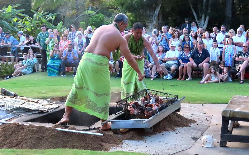 The Imo Ceremony at 6PM explained the Hawaiian cooking method called Kalua - where Kalua pig is wrapped in ti leaves and cooked in an earthen Imo oven and ended with opening the earth and removing the pig which would be served latter. A member of the Smith family narrated the ceremony.