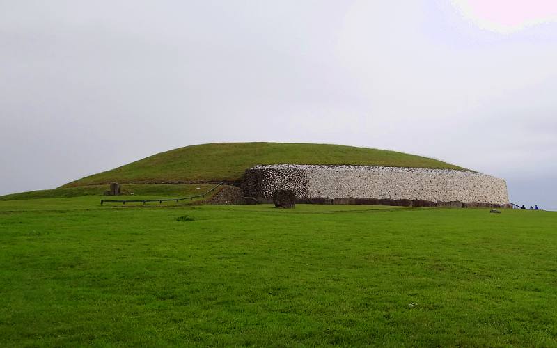 River Boyne Sunday (day 2) We were up fairly early to join a tour with Mary Gibbons. We traveled by bus to Newgrange. It was our first glimpse of the Irish countryside. Mary gave a constant commentary. Maybe a little too constant. She tended to repeat herself. As we approached Newgrange, the road was flooded from heavy rains overnight. The bus got through, but went very slowly through the water. We warned the driver of a small car on the other side of the flooded stretch not to try it. This is a good time to touch on the weather. The highs in Ireland were in the mid to upper 60s every day and it rained part of every day. Not hard rain, but the longest stretch I recall without some rain was about 6 hours. We mostly ignored the rain and just continued what we were doing. This was normal weather for Ireland. It is a temperate island and the temperatures only break into the upper 80s once or twice a decade. The winters are also temperate with coastal areas only getting frost only a few times a year. Getting back to the trip, this day was spent in the Boyne Valley, which is about an hour north of Dublin. It was settled about 4,000 BC and there are many prehistoric structures. Much of the region was part of the Battle of the Boyne in 1690. There are historic and prehistoric ruins though much of the valley, but the biggest stop of our tour was Newgrange, a stone passage tomb built in 5,200 BC. The stone walled earth mound is over an acre in size and our tour included entering the 62' long passage where light only reaches at sunrise near the winter solstice. After we had a chance to see the prehistoric art and the 19th century graffiti in the end chamber, the lights were turned off and the dawn solstice light entering the chamber through the lintel window box was simulated.