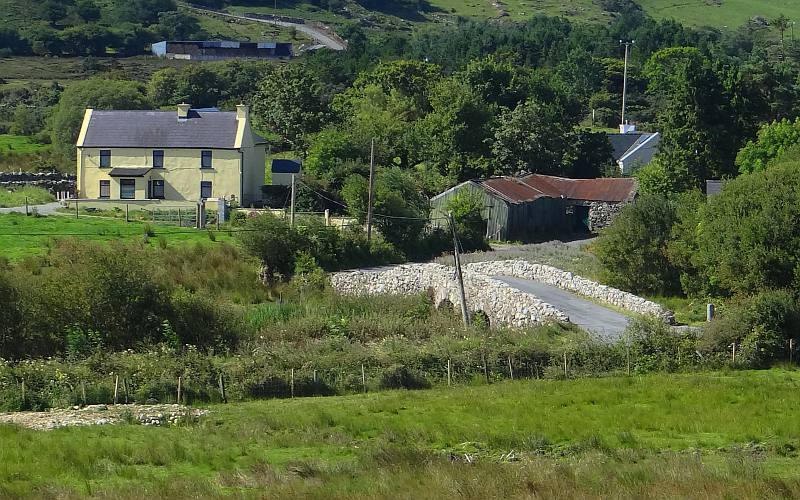 Quiet Man Bridge Wednesday (day 5) This was the final day of our three day tour and at 10AM we and the other 5 people were waiting at the station for the train to arrive with the day trippers. There were quite a few of them today and the Yellow Jacket gathered us up and walked us to a nearby half full tour bus operated by Galway Bus Tours. Today guide was Frank and he doubled as the bus driver. Frank did a good job and the only slightly odd thing about the tour was occasional extra stops to pick up or drop people off. We went in a rough figure eight through Connemara, a beautiful district of west Ireland which does not appear to have suffered as much from the Great Famine as other areas we had visited. There were few ruins and the hills and lakes reminded me of Scotland. We passed near Cong, a small village which was the location where John Ford's 1952 Oscar-winning film, The Quiet Man (John Wayne, Maureen O'Hara), was filmed, but made no stops. From a distance, we did see the bridge that was featured in the movie. We did stop in Leenane, a larger village where another movie (The Field with Richard Harris) was filmed. We used the rest rooms in Gaynor's Pub which was the set for "The Field Bar" in the film. It was also a chance to shop, get some cool drinks and photograph Lough Corrib, the second largest lake in Ireland.