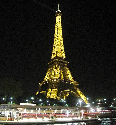After dinner we walked to the river and arrived at Bateaux Vedettes du Pont-Neuf just in time for the the 10 PM cruise. The boats have large banks of flood lights on one side and the tour starts west, going down the Seine, past the Eiffel Tower, back and past the other side of both of the islands (Île de la Cité & Île St.-Louis), then finally back past the Hôtel de Ville (City Hall), and passing under Pont-Neuf at the end of the tour. We sat on the boat's upper deck so we could see and photograph the many monuments and buildings by night. The banks of the Seine were lined with many young people partying. They would often wave or call to the boat as we passed. Near Notre Dame, one group of 4 turned and mooned us. After the hour cruise, we walked along the river on Île de la Cité to Notre Dame, then crossed the 1853 Petit Pont (Little Bridge) to the Latin Quarter. As we walked along the Left Bank there were many beautiful night time views and I wished that I hadn't left the engagement ring back in our room. If it had been along, I would have proposed at one of the bridges. We crossed back over the Seine on the Passerelle Léopold Sédar Senghor (footbridge) and attempted to cut through the Jardin des Tuileries to our hotel. But the gates to the garden were permanently locked. Se we walked along the right bank of the River Seine to the Place de la Concorde (Harmony Square), which we crossed to the rue de Rivoli and back to the Hotel Brighton. We stopped for a couple of minutes on the square to watch a photo shoot. The police were diverting part of the traffic and a fashon model was posing on the edge of the street with the Obelisk of Luxor in the background.