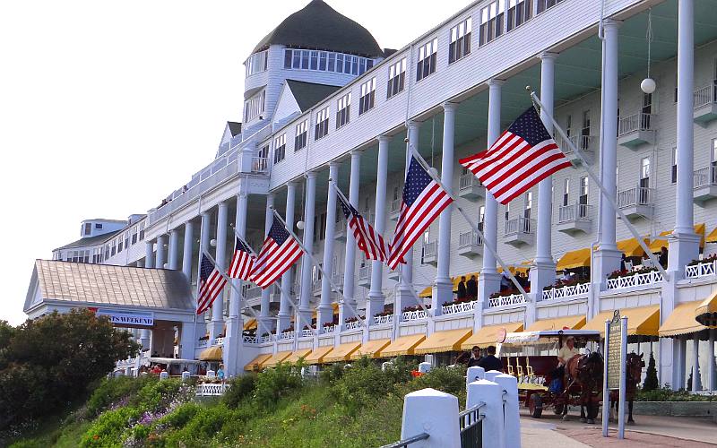 Grand Hotel Friday (continued) This was the first time I ever stayed at the 385 room Grand Hotel on Mackinac Island, which was built by the railroads in the 1880s. The hotel is famous for its 660' long front porch and was a centerpiece of the movies "This Time For Keeps" with Esther Williams & Jimmy Durante, and "Somewhere In Time" with Christopher Reeves & Jane Seymour. I had managed to secure a bargain price for a Category One room on a weekend, only $335/night including breakfast. The typical weekend price for this small room with a view of only the out building roofs, was $610 including breakfast and supper. Although the room was small, it was fairly modern. Fresh flowers and a pound of fudge were waiting for us. The fudge, the porch & grounds, and wifi are about the only thing the hotel provides without additional fees. There is even an $8/person fee for moving luggage between the docks and the hotel. At least there is no tipping at Mackinac Island's Grand Hotel.