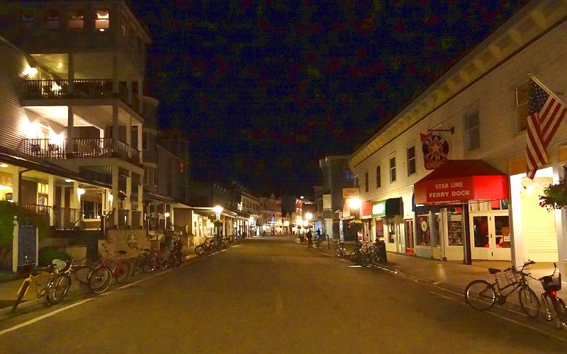 The Grand Hotel has a dress code after 6:30 PM (Jacket, tie & dress pants for men. Dress, skirt and blouse or pantsuit for ladies). Since our hotel package did not include dinner, I wanted to try a different restaurant this evening. After freshening up, we took a horse drawn taxi to The Woods, another Grand Hotel property on the Island's interior, which I last visited many years ago. It is a beautiful Tudor mansion with enormous windows which look out on the surrounding woods. The menu is German influenced and I had a smoked trout appetizer and pork schnitzel for my entree. The food was good, but not outstanding, with my favorite part of the meal being the bread. Linda was happier with her maple baked Atlantic salmon and lobster mashed potatoes. We were both unhappy with the lobster bisque, which turned out to be tomato based and had no lobster which I could find.