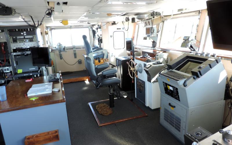 Saturday - day 4 (continued) Linda was ready to relax in the motel after the pageant, but I returned to St. Ignace, because none of the photos I had taken of the bridge of the Biscayne Bay on Thursday had been useable. LT. Perodeau had arranged for me to return to take new photos of that part of the ship. As I was taking a couple of exterior shots of the Biscayne Bay before leaving, I noticed a sign on the fence at the end of the dock saying that since 2001, the end of the dock has been reserved for the largest nesting colony of common terns in the upper Great Lakes. This is a collaboration between the Coast Guard and the Seney National Wildlife Refuge staff. Populations of the common tern have declined due to loss of breeding habitat and competition with gulls for nesting sites. Before returning to Mackinaw City, I did some additional photography of the Mackinac Bridge from the Upper Peninsula and of St. Anthony's Rock, one of several "sea stacks" in the area. Castle Rock is a much better sea stack.