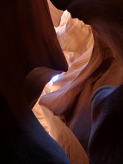 Lower Antelope Canyon ticket booth & parking Saturday - day 3 Saturday morning's breakfast was also furnished by the hotel where we stayed and had a fairly large selection for a free breakfast. I was the only one who was willing to taste the blue corn mush, which Mary & Linda thought looked like something that wasn't supposed to be food. There was nothing unpleasant about it, but there wasn't much flavor either. Our principal stop for the day was Antelope Canyon, a slot canyon just a few miles southeast of town on Navajo land. A slot canyon is a narrow canyon, significantly deeper than it is wide. Although I wanted to go to Lower Antelope Canyon, we went to Upper Antelope, where I thought the experience would be a little less strenuous for Linda. It involves a 4x4 ride to the canyon, where it is possible to walk right in. However that canyon is much more visited (which was part of the reason I wanted the other) and we would have had to wait an hour & a half before a tour would leave. It is also twice as expensive So we went to the Lower Antelope Canyon, which was just across the highway. Lower Antelope Canyon is Hasdestwazi, or "spiral rock arches" in the Navajo language. A guided tour is $20 for adults, plus $6 for admission to the Tribal Park. The admission which we had paid across the highway at the upper canyon was also good here. The guided tour takes you on a walk a short distance from the parking area, then has you enter a narrow crack in the ground, climbing down rocks and stairs to the bottom of the canyon. The line of people walking into the narrow crevice is a little surreal.