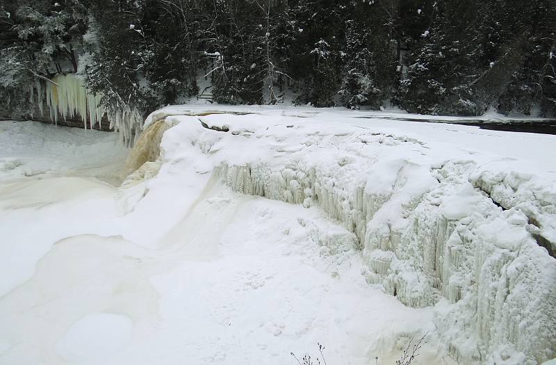 The 200' face of Tahquamenon Falls is frozen almost all the way across.